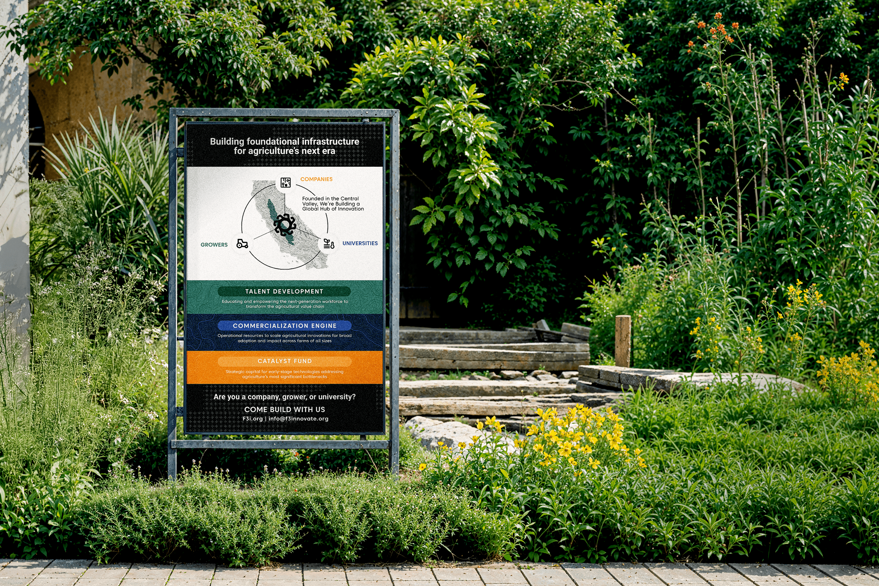 F3 Innovate is a Central California nonprofit advancing agricultural infrastructure. My agency was brought in to redesign their public website and build an event design system ahead of a major stakeholder conference — as the sole designer, with under four weeks on the clock.