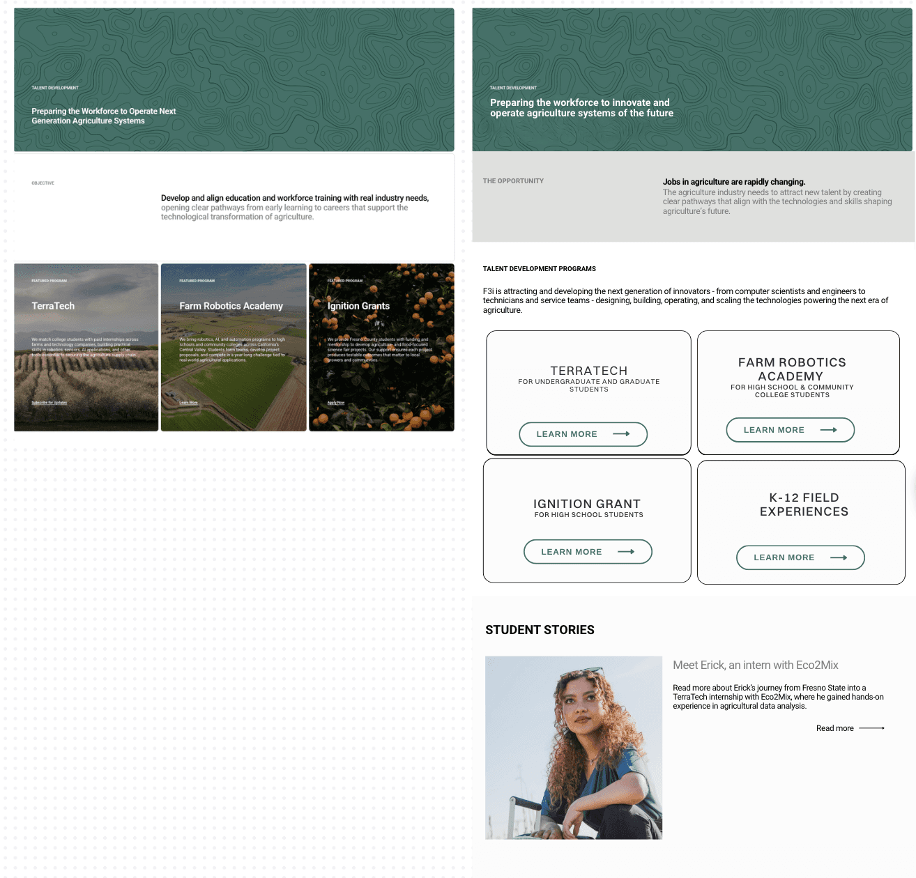 (Agtech startups, farming enterprises) Needed to know specifically what F3i could do for them. Not an organizational overview, but a direct path to the relevant program.