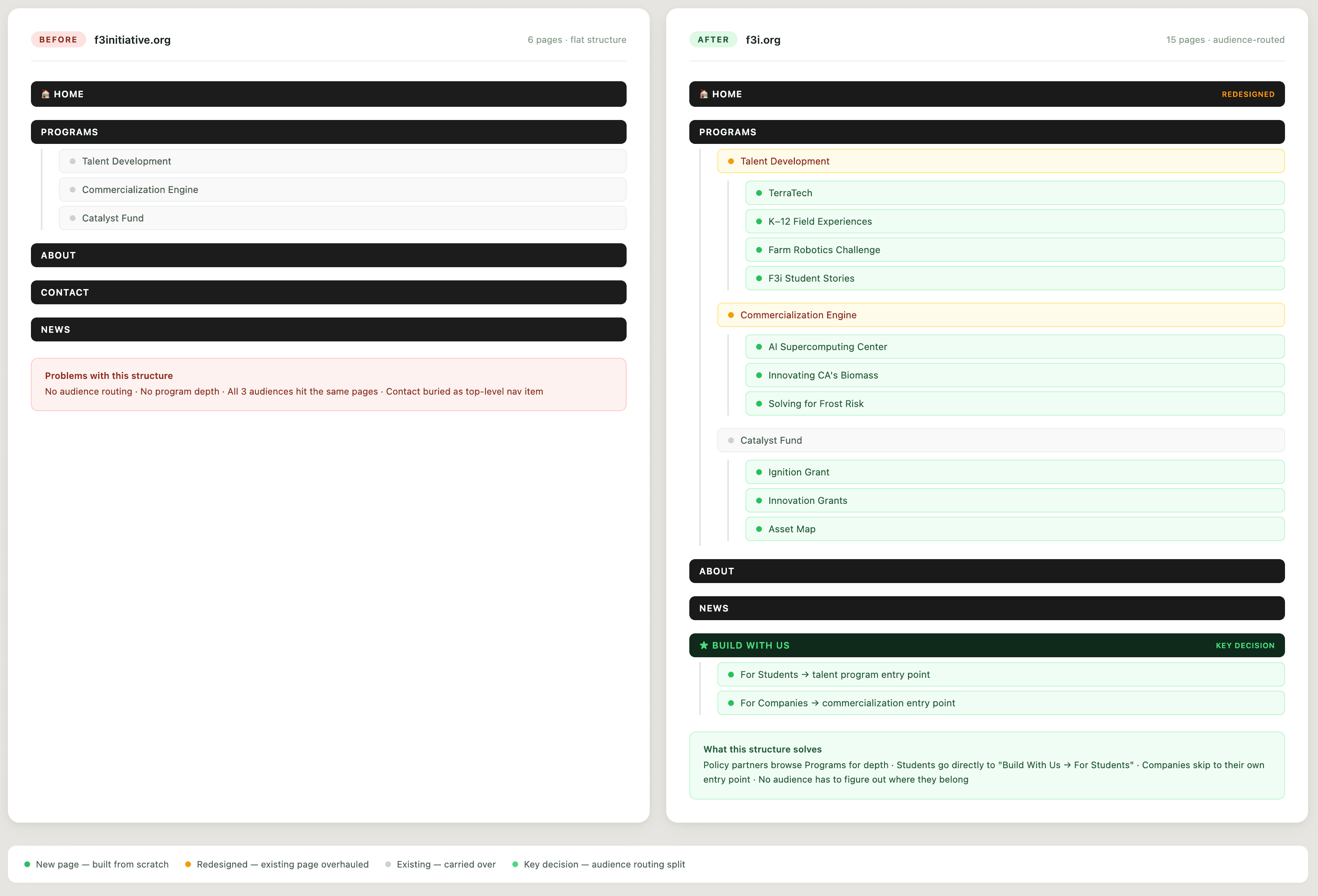 F3i provided a rough Canva sitemap: a starting list of pages, not a finished IA. I audited the existing six-page site against the brief and mapped each page to the key questions visitors would ask.