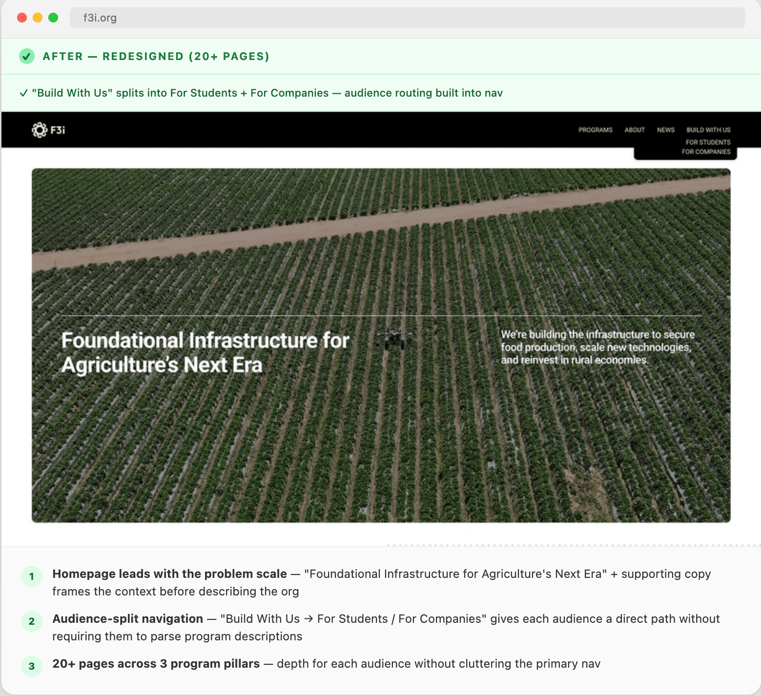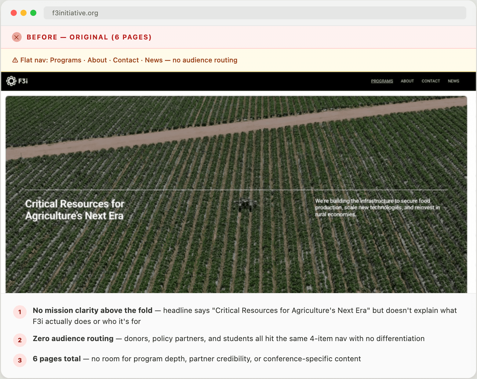 F3i's leadership came to us with a direct diagnosis: people visiting the site didn't understand what F3i actually does. For an organization trying to build credibility with government policy partners, attract donors, and connect with the farming community, that's a critical failure. The site existed but it just couldn't do its job.