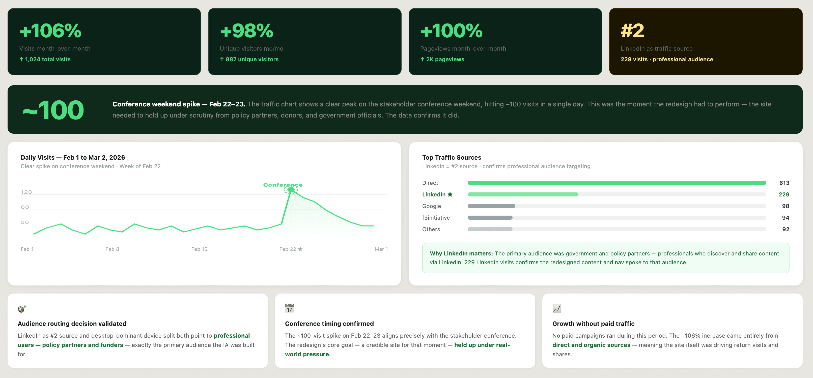 LinkedIn was the #2 traffic source at 229 visits, behind only direct traffic (613). The primary audience for the site was government and policy partners which were professionals who move through LinkedIn. The IA decision to give that audience a direct entry point appears to have supported how they actually arrived and navigated the site.