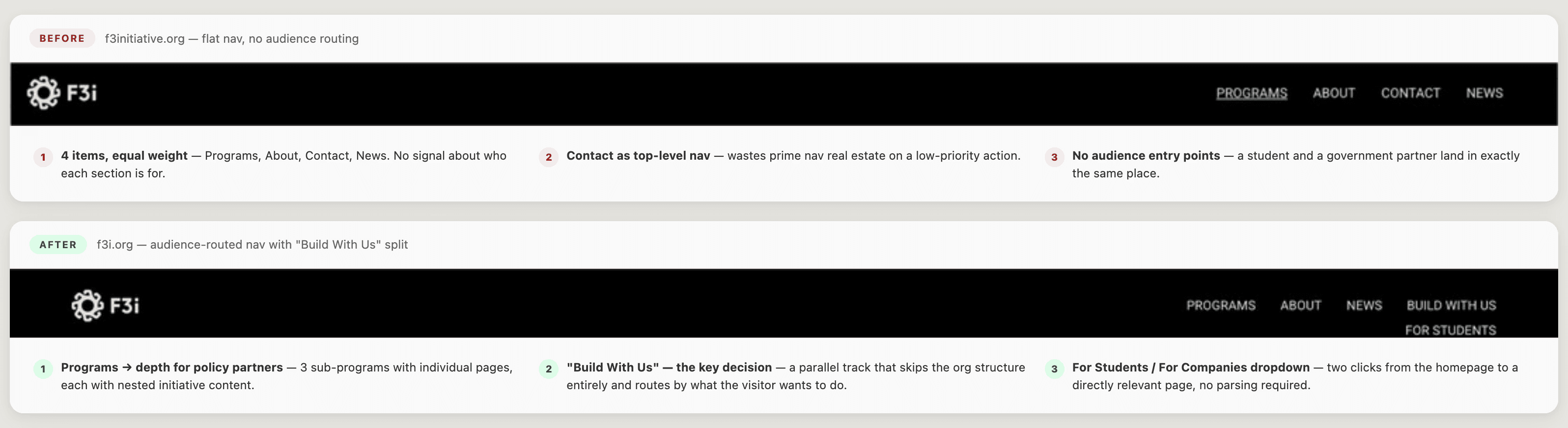 F3i's original brief organized the site around what the organization does internally. The redesigned navigation adds a 'Build With Us' section split explicitly into For Students and For Companies, pulling audience-specific content out of generic program pages and giving each group a direct entry point.